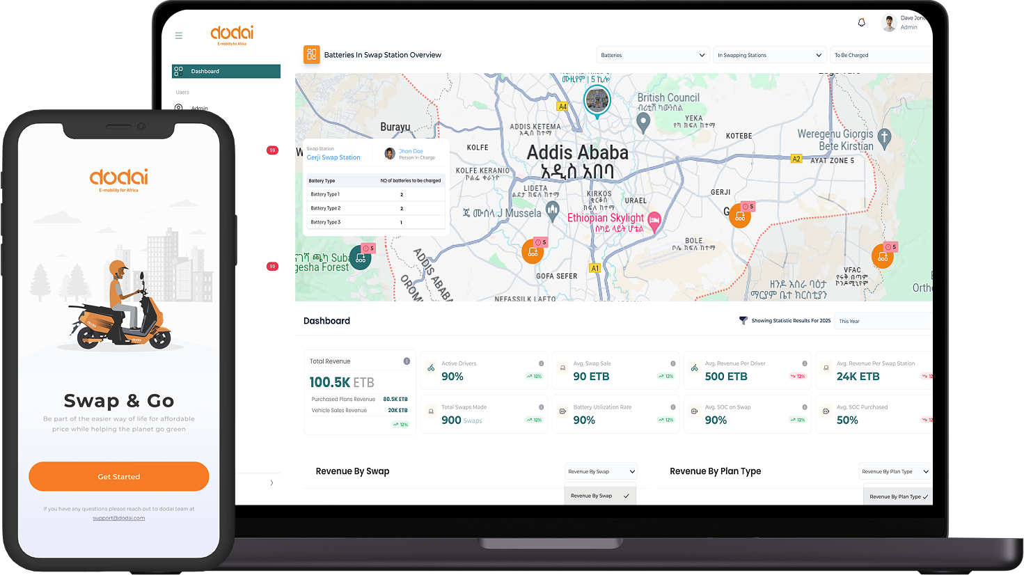 Dodai is an innovative electric motorcycle manufacturer. Swenetix developed an admin dashboard named Dodai, which connects drivers, swappers, and distributors. The ecosystem enables seamless battery swaps, subscription and prepaid plans, and real-time monitoring of stations and batteries.With features such as swap history, payment analytics, and SOC (State of Charge) tracking, Dodai empowers operators and riders to manage operations efficiently, ensuring smooth and data-driven experiences across the entire ecosystem. Swenetix is proud of this transformative project for shaping the future of urban mobility in Ethiopia and Africa.